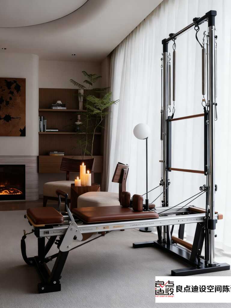 普拉提器械的選擇也很用心哦~ 淺木色的框架搭配黑色的配件,和整體的溫柔色調***融合,一點都不突兀~ 而且器械的擺放也很講究,留出了足夠的活動空間,練起來完全不會覺得擁擠~ 還有那個垂感超好的米色窗簾,陽光透過窗簾灑進來的時候,整個空間都變得暖洋洋的,練普拉提的時候心情都會變好~